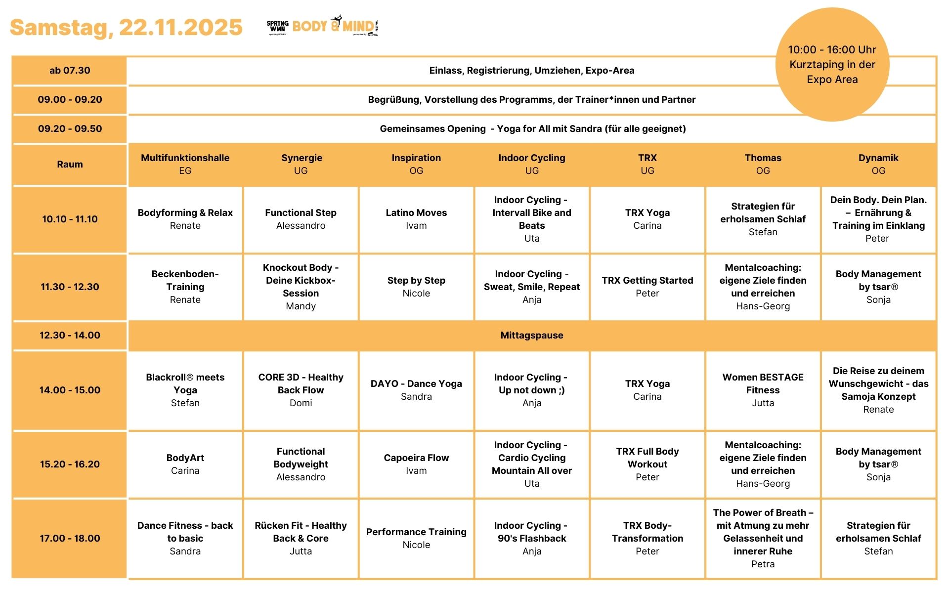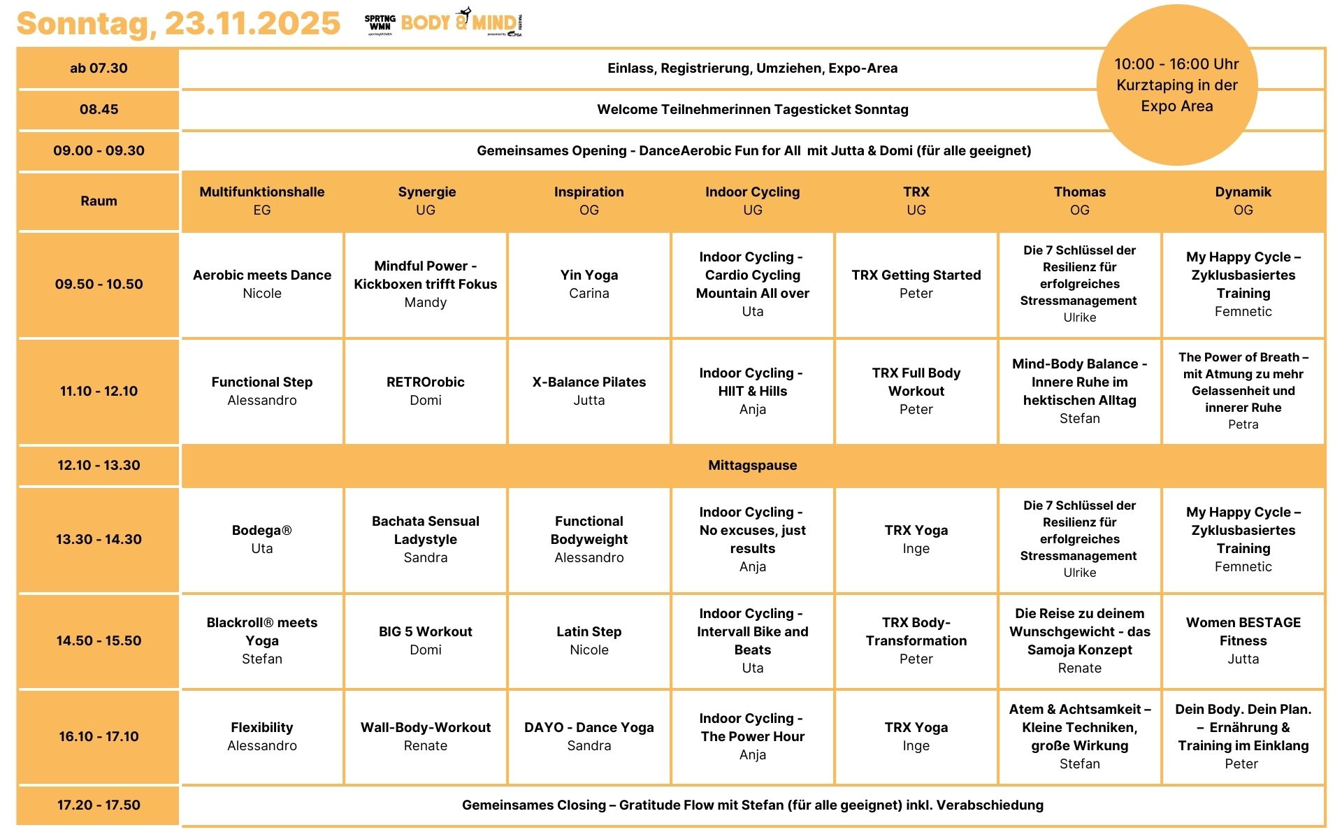 Starte in den Tag mit einem gemeinsamen Opening und tauche anschließend in eine Vielzahl von Workshops und Trainings ein. Egal ob du dich für Kickboxen, Indoor Cycling, Pilates oder TRX interessierst – bei uns findest du genau das Richtige für dein Fitnesslevel und deine Vorlieben.
